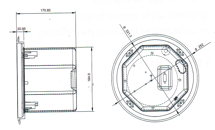 Габариты - диаметр 252мм, глубина 171мм (установочный диаметр 220мм)