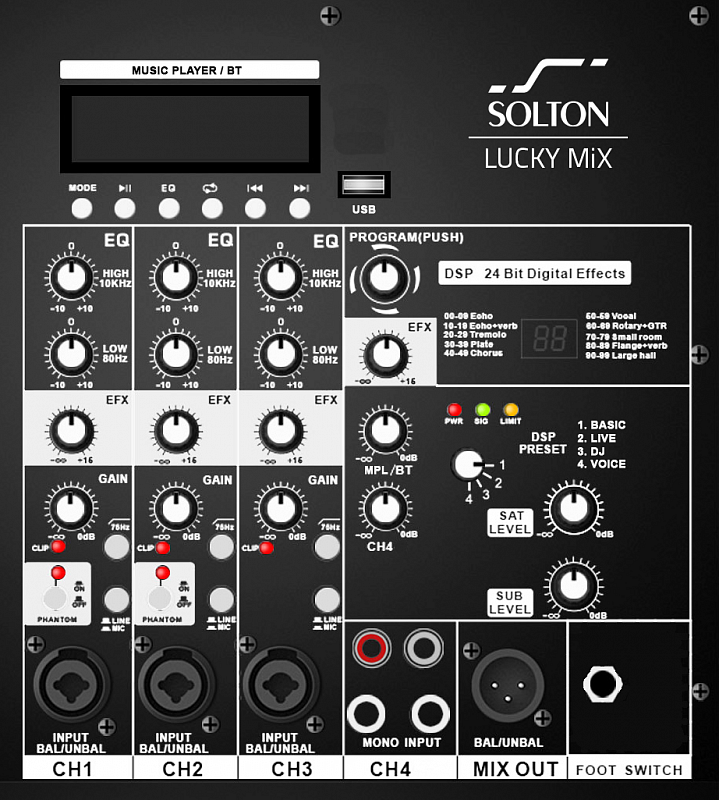 USB MP3/Bluetooth плеер на отдельном канале; Четыре DSP пресета: ( Music, Live, DJ, Speech ); 24